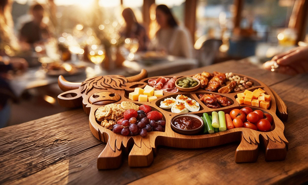 She smiled and told me it's called the Glosritystore™ Highland Cow Platter, a handcrafted wooden serving tray that's as much a piece of art as it is a party essential.
