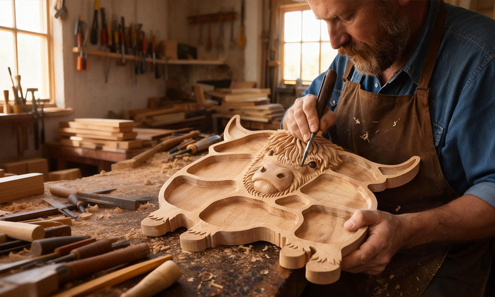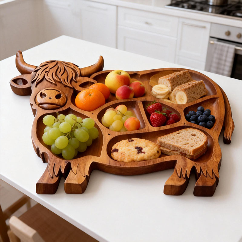 Tired of the same old boring serving trays? This hand-carved wooden Highland Cow tray brings serious personality to any gathering — no two are exactly alike thanks to the unique wood grain and craftsmanship.